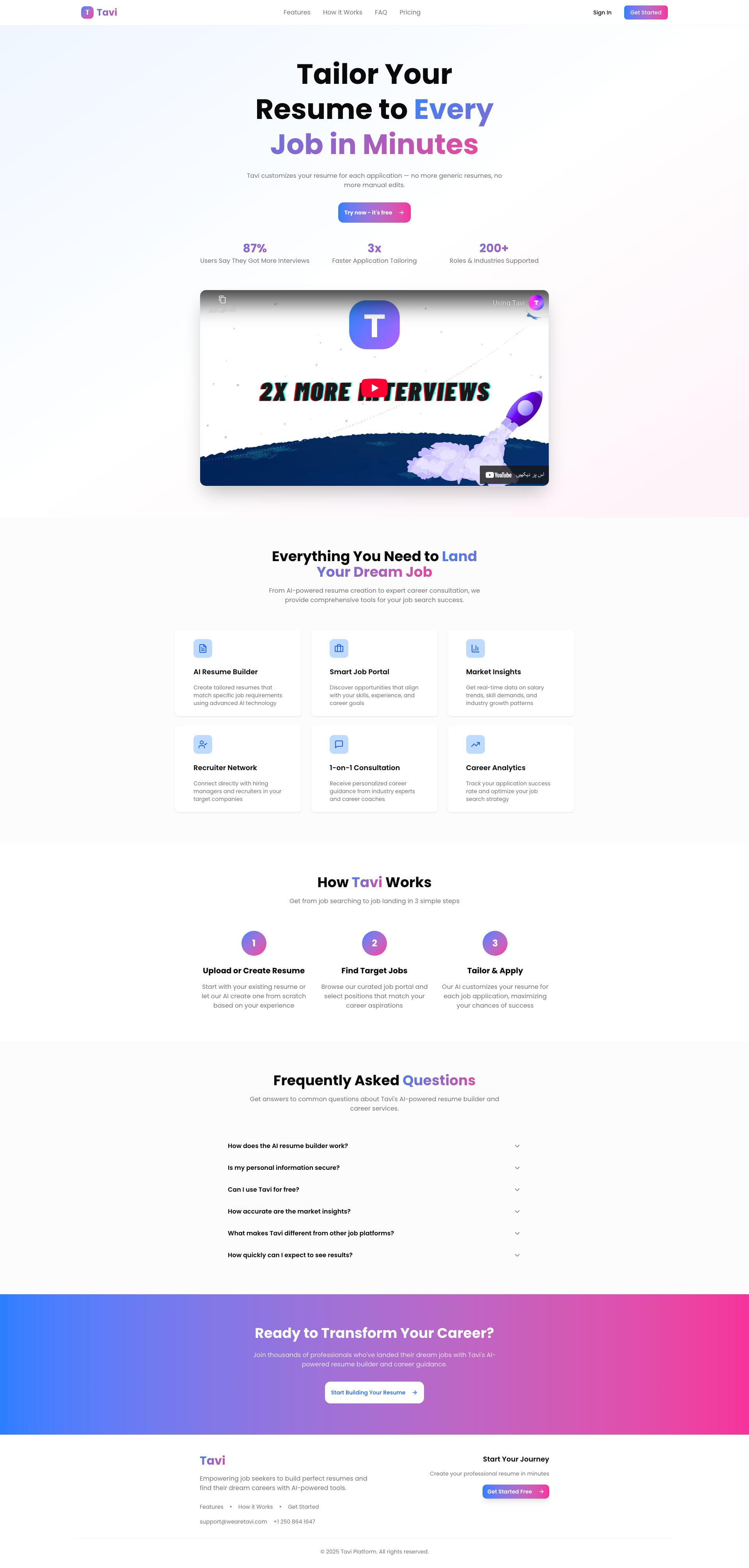 Job seekers are fighting algorithmic HR software. Tavi was built as the ultimate equalizer. The user uploads a base resume alongside a target job description. Tavi's AI engine breaks down semantic similarities, scoring the resume against the job post, and surgically rewrites bullet points to highlight matching capabilities while maintaining utmost truthfulness. To date, this platform has helped thousands land interviews at Fortune 500 corporations by boosting their ATS match rates.