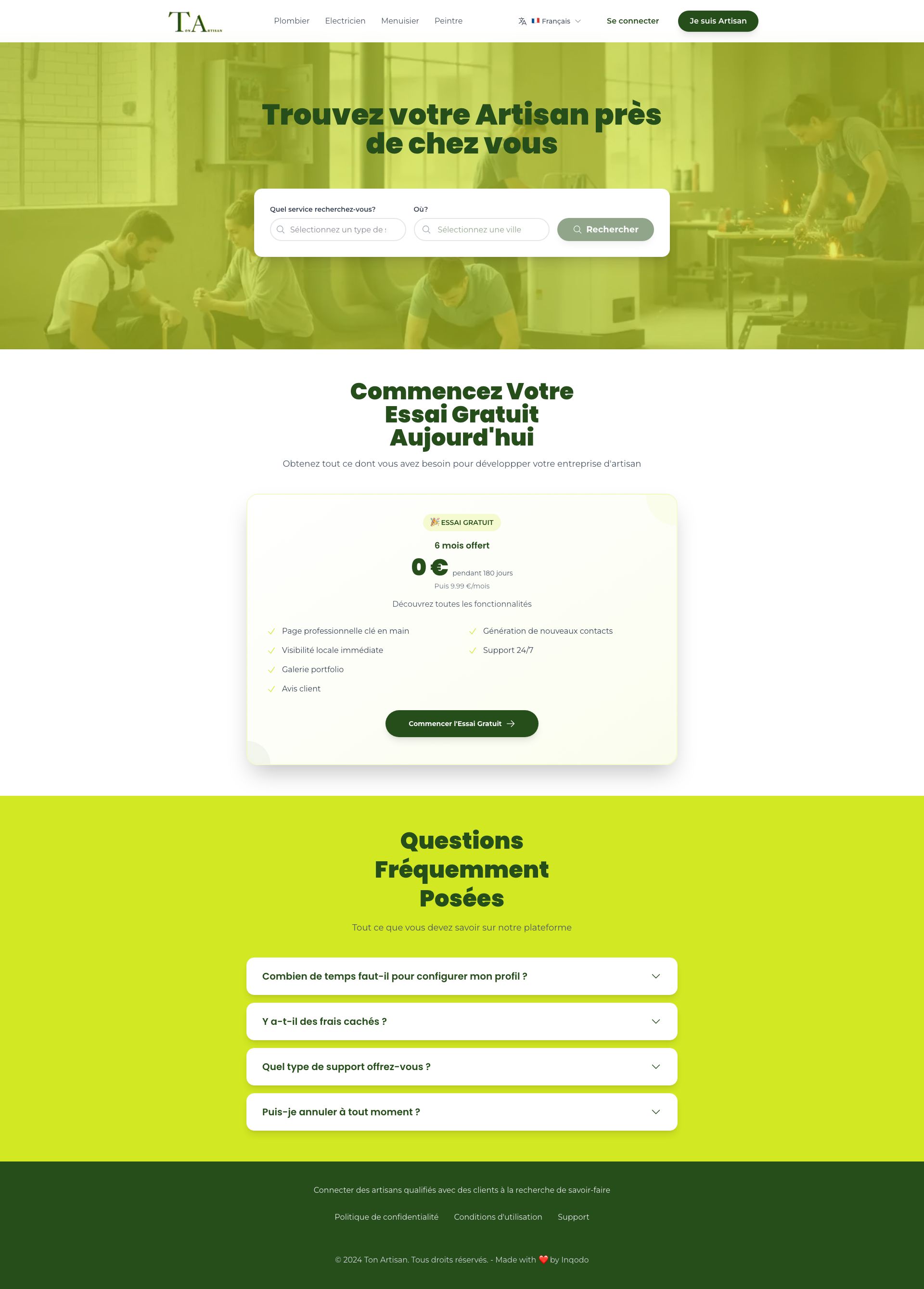 The renovation industry is often plagued by a lack of trust. Ton Artisan was built to deliver transparency and speed to the French property market. Homeowners can define project parameters using an interactive guided quiz algorithm, and the system intelligently notifies pre-vetted contractors within a precise geo-radius. The integration of review networks, identity verification, and built-in project messaging heavily increased completed project satisfaction rates.
